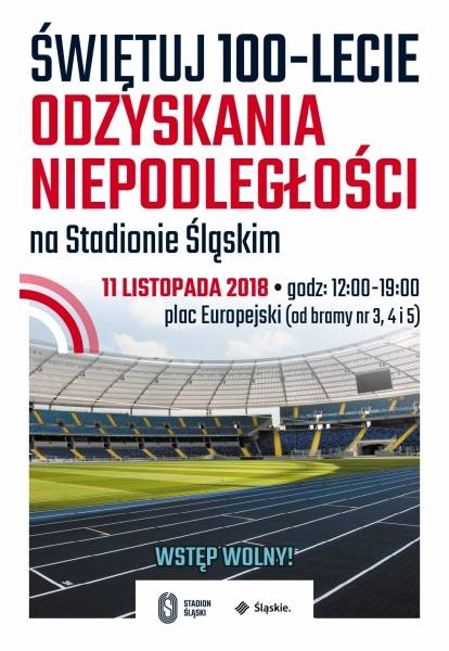 Stadion Śląski zaprasza do wspólnego świętowania setnej rocznicy odzyskania niepodległości. Oprócz wystawy militariów, pokazów laserowych oraz występów artystycznych i konkursów z nagrodami będzie można także zasiąść na trybunie Śląskiego i zrobić sobie pamiątkowe zdjęcie. Wstęp wolny.