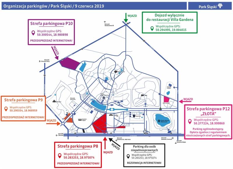 • Od 11:00 do 21:00 wjazd możliwy dla posiadaczy biletów parkingowych dla osób niepełnosprawnych w celu dojazdu do miejsc dla osób niepełnosprawnych. Bilety parkingowe na dedykowane miejsca dla osób niepełnosprawnych będzie można zarezerwować i pobrać w systemie rezerwacji miejsc parkingowych Parku Śląskiego na stronie: www.e-bilet.pl. Liczba wejściówek ograniczona jest do 40, a o ich wydaniu decyduje kolejność zgłoszeń.