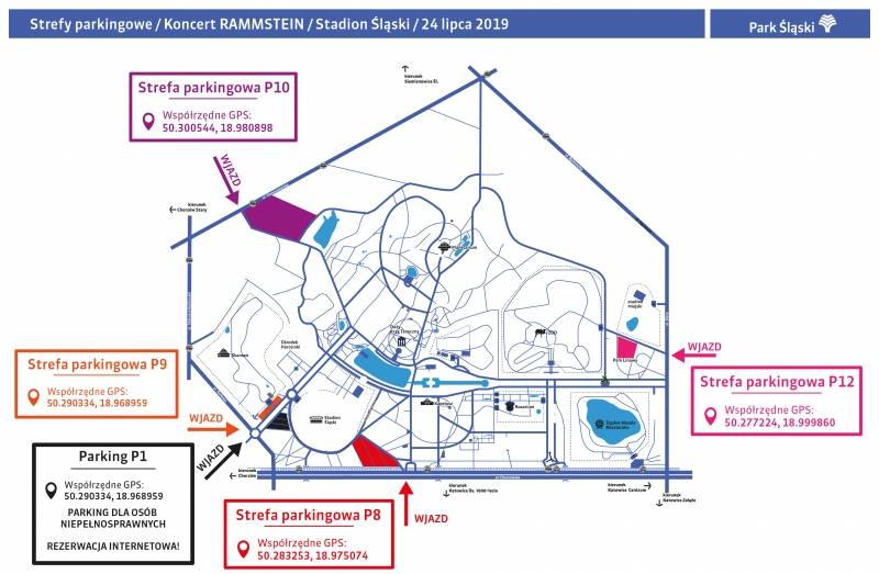 W dniu 24 lipca 2019 roku na Stadionie Śląskim w Chorzowie odbędzie się Koncert „Rammstein”. Park Śląski udostępni miejsca parkingowe, które zlokalizowane będą w 4 strefach parkingowych oraz miejsca parkingowe dla osób niepełnosprawnych na Parkingu P1, zgodnie z mapą i rozpiską poniżej.