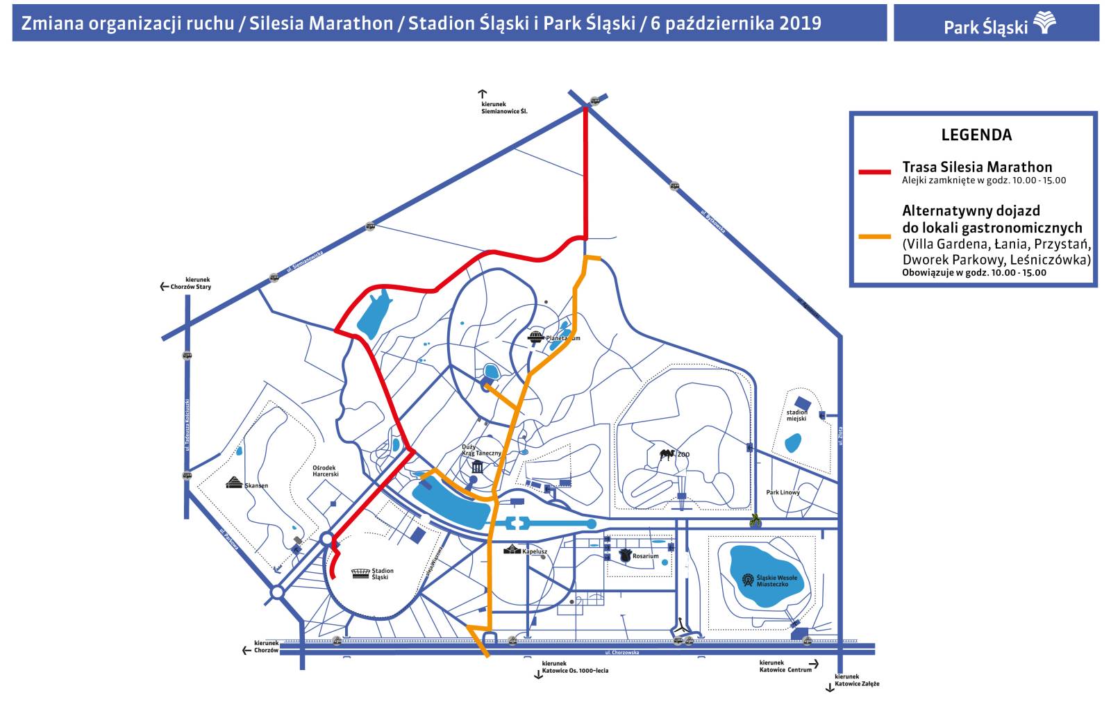 W godzinach od 10:00 do 15:00 ze względu na przebieg trasy biegów zamknięty zostanie wjazd do Parku Śląskiego od ul. Bytkowskiej, z kolei utrudnienia występować będą: