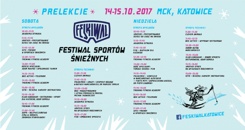 Podczas Feskiwalu na Śląsk zawitają największe stowarzyszenia śnieżne, m.in. Polski Związek Narciarski, Stowarzyszenie Instruktorów i Trenerów Narciarstwa, Stowarzyszenie Instruktorów i Trenerów Snowboardu oraz Polski Związek Biathlonu. Dodatkowo trenerzy, zawodnicy i lekarze opowiedzą nam o swoich dyscyplinach. Ogromną atrakcją będą goście specjalni, czyli: Adam Małysz z trenerem Apoloniuszem Tajnerem oraz biathlonista - Tomasz Sikora. Opowiedzą oni uczestnikom festiwalu o swojej karierze i o tym, jak przygotować się do uprawiania danej dyscypliny. Adam Małysz wraz z Apoloniuszem Tajnerem będzie gościem Feskiwalu w sobotę między 13:00 i 15:00, natomiast z Tomaszem Sikorą spotkamy się w niedzielę - 15 października - o tej samej porze.