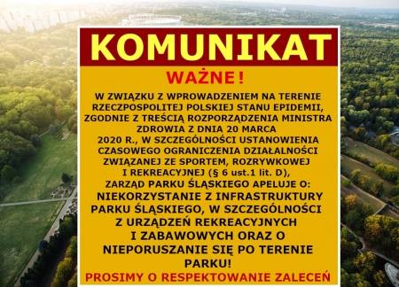 W związku z wprowadzeniem na terenie kraju stanu epidemii, zgodnie z rozporządzeniem Ministerstwa Zdrowia z dnia 20.03.2020r., w szczególności ustanowienia czasowego ograniczenia działalności związanej ze sportem, rozrywką i rekreacją, Zarząd Parku Śląskiego apeluje o to, by nie korzystać z infrastruktury Parku Śląskiego.