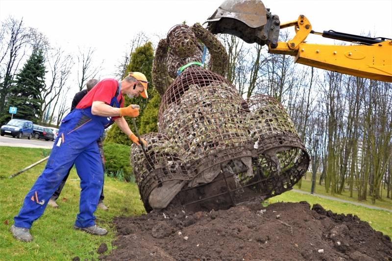 Właśnie przeniesiono ją kilkadziesiąt metrów wyżej, w kierunku alei Spacerowej. W jej dotychczasowym miejscu staną natomiast „Źrebaki” Anny Dębskiej, jedna z najcenniejszych parkowych rzeźb, która już wkrótce zostanie poddana renowacji. Obsadzanie wiewiórki i innych plenerowych rzeźb kwiatami nastąpi po „trzech ogrodnikach” i „zimnej Zośce”.