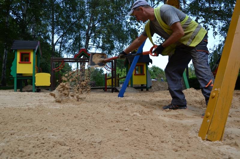 Prace wykonano na dwóch placach zabaw w Rosarium i przy promenadzie gen. J. Ziętka. Wymianie poddano piasek, w którym maluchy uwielbiają się bawić. W czwartek, 13 sierpnia trwały ostatnie prace związane z jego rozgarnianiem. Rodzice mogą być spokojni, posiada wymagane normy i atesty. Dodatkowo, wszystkie brakujące elementy przeszkód i przedmiotów do zabaw zostały uzupełnione. Bawialnie odebrała specjalna firma, przyznając gwarancję jakości.