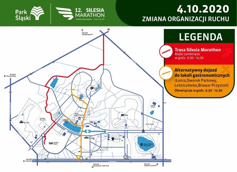 • od godziny 9:30 do godziny 14:30 ze względu na przebieg trasy biegu Silesia Marathon zamknięte zostaną: