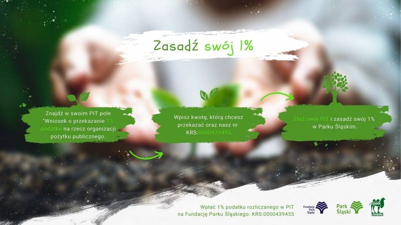 Zasadź 1% podatku w Parku Śląskim, przekaż 1% swojego podatku! Jak to zrobić? Wystarczy wpisać w rozliczeniu podatkowym w okienku "Wniosek o przekazanie 1% podatku na rzecz organizacji pożytku publicznego" nasz numer KRS: 0000439455. Dziękujemy, że jesteście z nami!